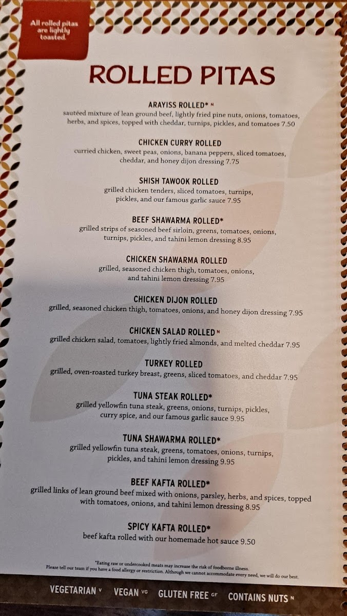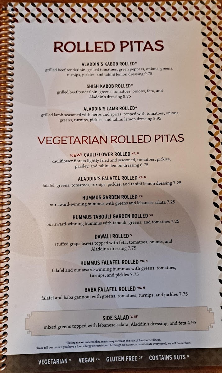 For a satisfying main course, try one of their Rolled Pitas. The Aladdin's Kabob Rolled Pita features grilled tenderloin and fresh vegetables, while the Shish Kabob Rolled Pita dazzles with its unique dressing, both at $8.75. Don't forget to indulge in their decadent desserts, like an assortment of baklava, perfect for sharing.